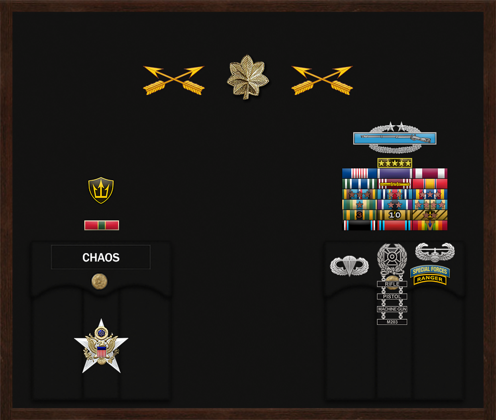 Combat Infantryman Badge (CIB3) Major Chaos The Secretary of the Army has reposed special trust and confidence in your patriotism, valor, fidelity and professional excellence. In view of these qualities, your demonstrated leadership potential, and dedicated service to the United States Army and the unit, you are, therefore, awarded the Combat Infantryman Badge (CIB3). Awarded: Dec 20, 2025 Signed, Task Force Headquarters CO/XO |